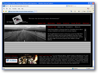 Street Visionz Media is a full-service Media agency based in Gainesville, Fl and New York City. We provide consumer-focused, business-to-business, direct marketing, guerilla marketing and on-line advertising solutions. Street Visionz services include: marketing plans, research, strategy, media planning/buying, promotions, mixed media campaigns, creative development, production, design, packaging, direct mail, and print collateral as well as broadcast, interactive, multimedia, website development and optimization and eMarketing. |